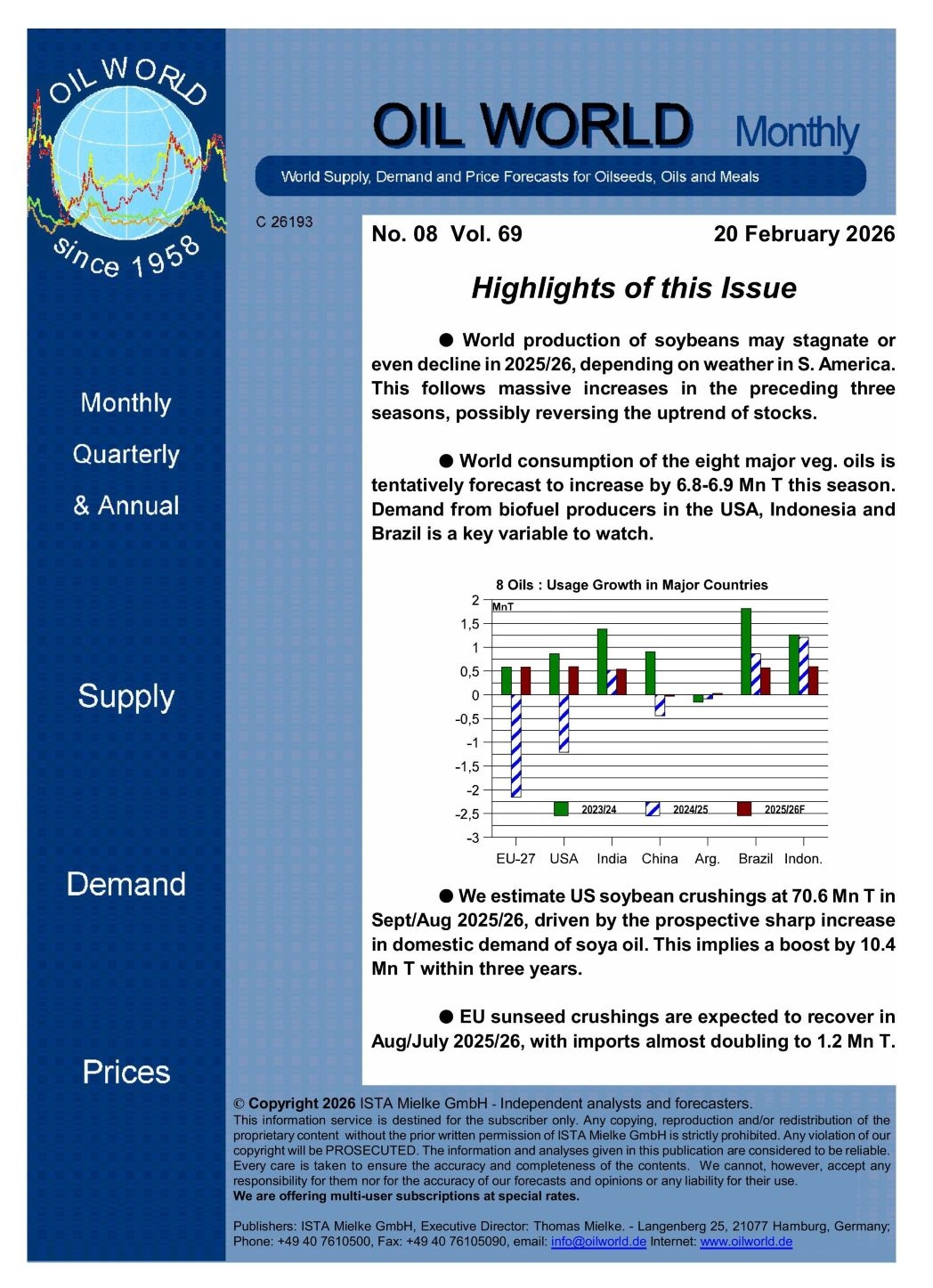 • World production of soybeans may stagnate or even decline in 2025/26, depending on weather in S. America. This follows massive increases in the preceding three seasons, possibly reversing the uptrend of stocks....