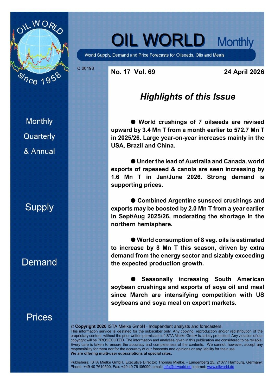 • World crushings of 7 oilseeds are revised upward by 3.4 Mn T from a month earlier to 572.7 Mn T in 2025/26. Large year-on-year increases mainly in the USA, Brazil and China...