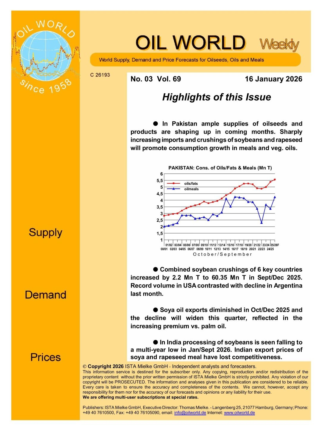 The weekly forecasting and information service for all the major oilseeds as well as for vegetable and animal oils & fats and for oilmeals is read in approximately 100 countries worldwide. You will benefit from our long-running experience of more than 40 years and our unique world database. The semi-annual subscription to the WEEKLY includes six special MONTHLY issues with price forecasts for the next several months.